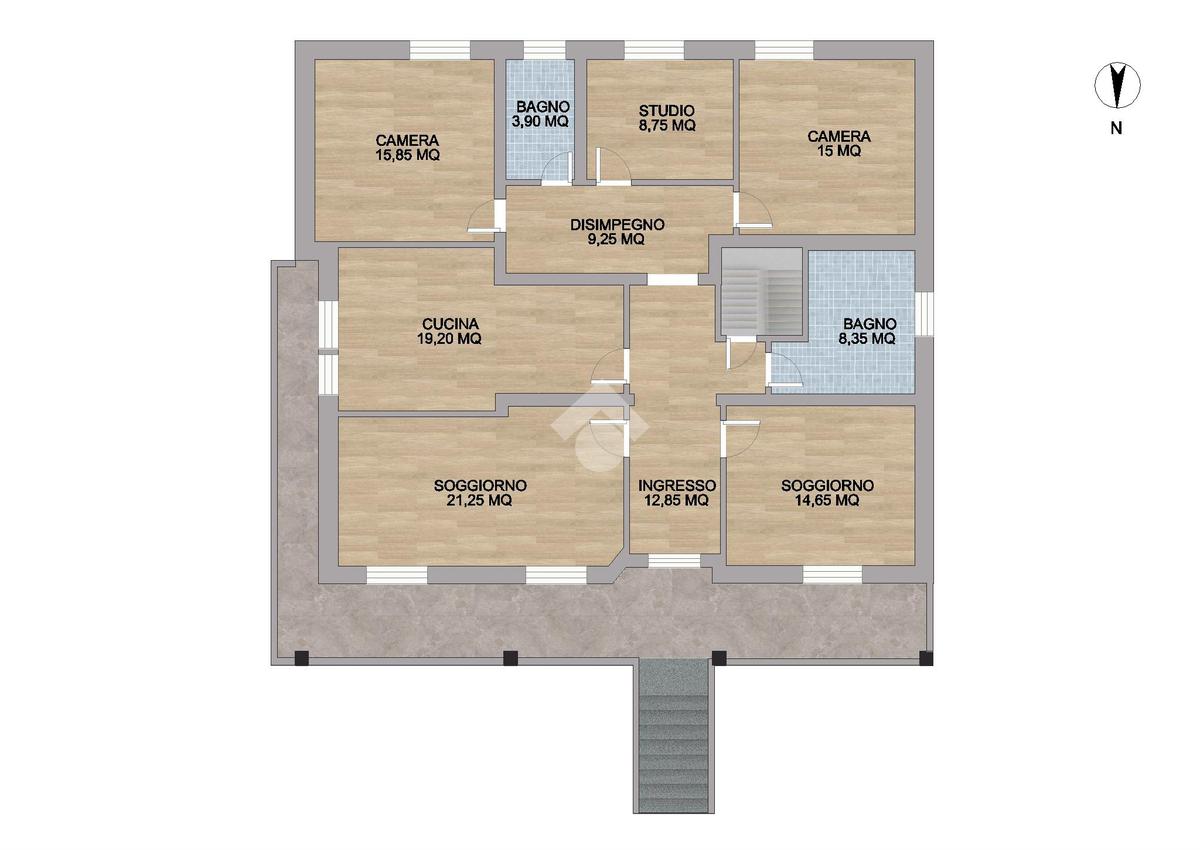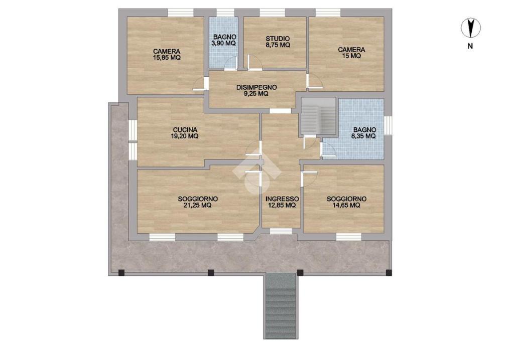 L'ingresso principale si apre direttamente sul verde del giardino al piano terra, da cui una breve rampa di scale conduce all'abitazione vera e propria, posizionata al piano rialzato.